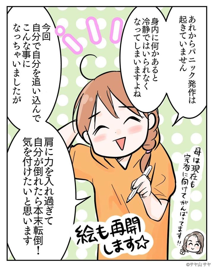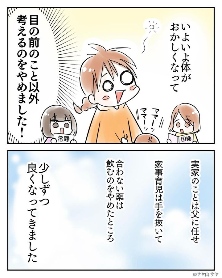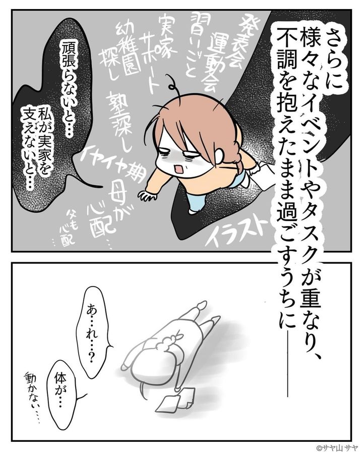 お母さんが病気になったことから“私がしっかりせねば…”と過度なプレッシャーをかけ続けてしまったサヤ山 サヤさん。さらに、イベントやタスクなどが重なり、ついには体が動かなくなってしまったそう。そんな時、ぷみおさんが「今は何もしないで休もう」と声をかけてくれたことで、やっと肩の力が抜けたサヤ山 サヤさん。体調も少しずつ回復しているようです…!