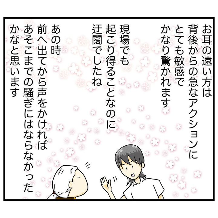倉畑コウキさんは特別養護老人ホームで働いており、今回のような出来事は、現場でも起こり得ることなのだそう。職業柄、耳の遠い人への接し方を心得ていたものの、薬局ではオフモードだったのか、後ろから声をかけてしまったようです。