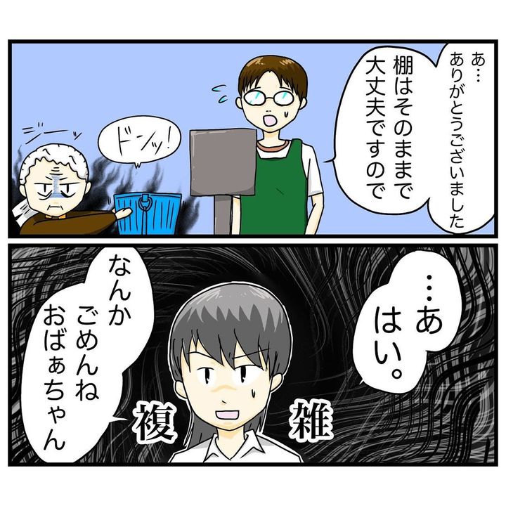 レジの店員さんに何度声をかけられてもおばあさんが動こうとしなかったため、倉畑コウキさんは後ろから声を掛けたそう。すると、おばあさんはびっくり!耳の遠い人は背後からの急なアクションにとても敏感であることを思い出した倉畑コウキさんは「前へ出てから声をかければあそこまでの騒ぎにならなかった」と、申し訳なく感じたのでした…。