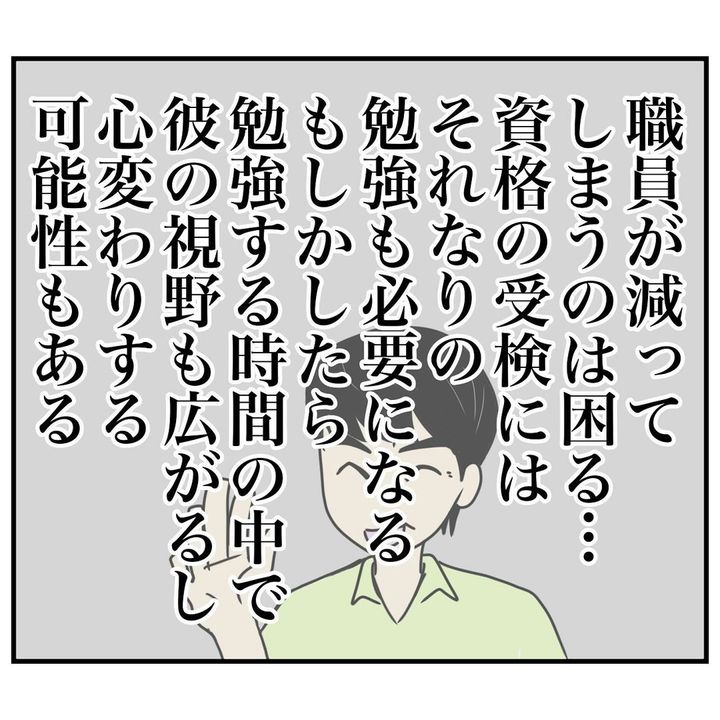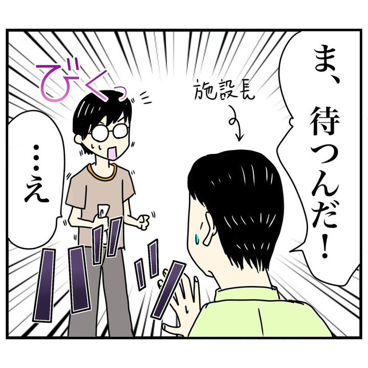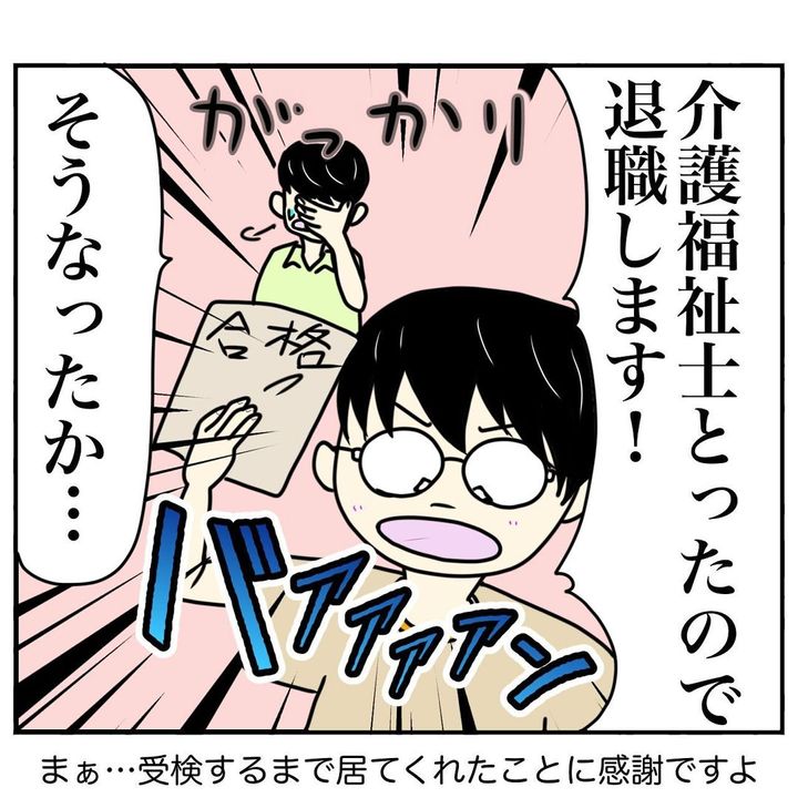 引き留めたい施設長は、介護福祉士の受験条件である“実務経験3年”まで勤務して、資格取得を目指すことを提案。同僚は納得し、退職は一端なかったことに。施設長はひと安心し「勉強する時間の中で彼の視野も広がるし、心変わりする可能性もある」と、淡い期待を抱いたようです。結局、資格を取得した同僚は退職してしまい、がっくりと肩を落とす施設長でした…。