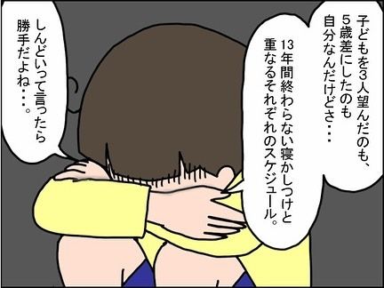 SAKURAさんは点滴をしてもらって、少しだけ回復した様子。しかしふと“5歳差の育児”に悩み、落ち込んでしまいます…。そんな時、「子どもたちは俺が見るし、掃除も洗濯も皿洗いも俺やるから寝たらいいさあー」と言ってくれる旦那さんのおかげで、心が楽になるのでした。
