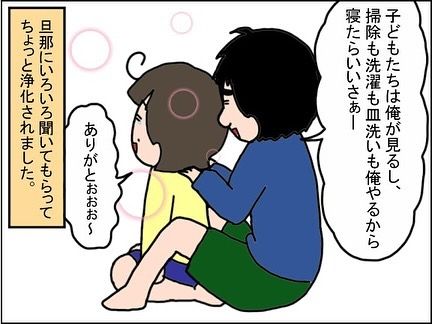 それにしても、旦那さんの対応が温かい!寄り添って話を聞いてくれる旦那さんと一緒ならどんな困難でも乗り越えられそうな気がします!自分を労わる時間を作りつつ、旦那さんと二人三脚で支え合っていけるといいですね。