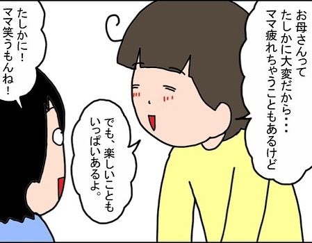 「母って大変だよね」とSAKURAさんを励ますきーさん。その言葉にSAKURAさんは「でも、楽しいこともいっぱいあるよ」と返し、きーさんをギュッと抱きしめます。しかし、きーさんに気を遣わせてしまったことを反省し、ちょっぴり落ち込んでしまうのでした。