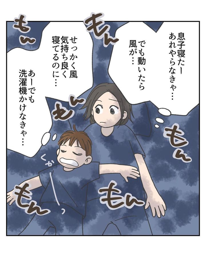 長男の寝かしつけをしていると、風くんが足元にやってきて、りんりんさんの足の上で眠りに就きます。家事を片付けなければならなかったのですが、風くんを起こすまいとするがあまり、りんりんさんも朝まで眠ってしまうのでした。