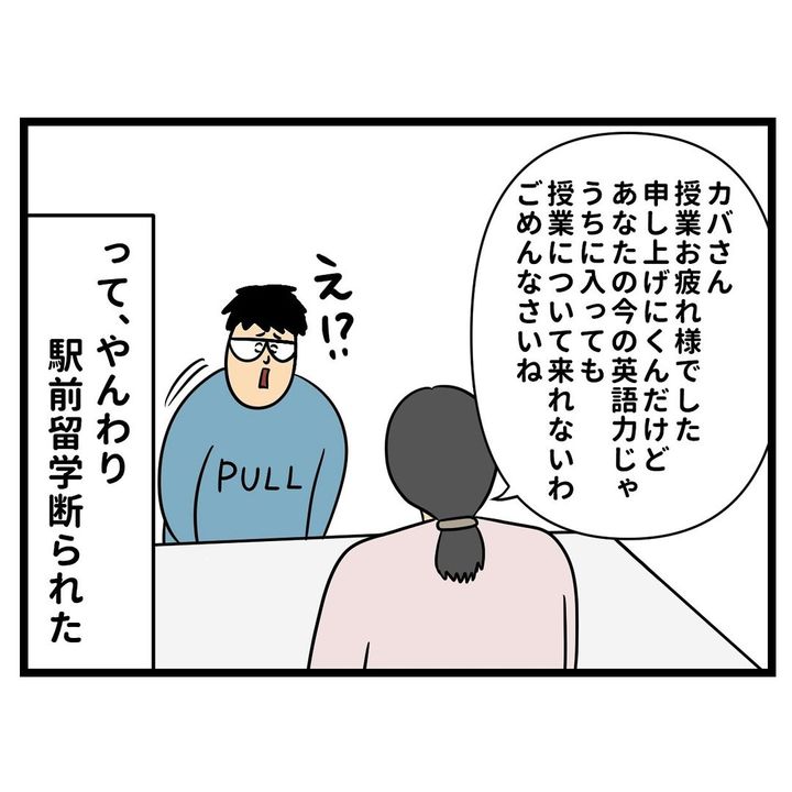 ハワイ旅行を前に、英語力への不安を口にするカバさん。以前、「駅前留学」を体験しに行ったことがあるそうですが、体験授業を終えると、「申し上げにくいんだけど あなたの今の英語力じゃうちに入っても授業について来れないわ ごめんなさいね」と、入会を断られてしまったのでした。