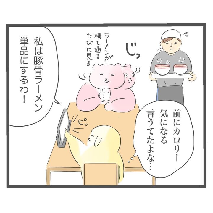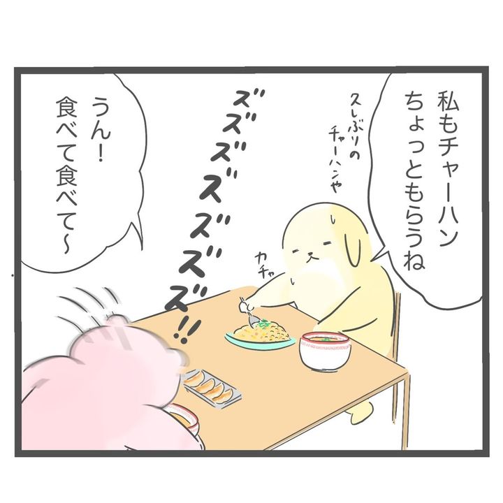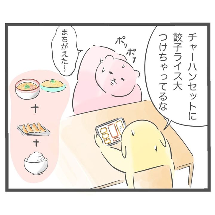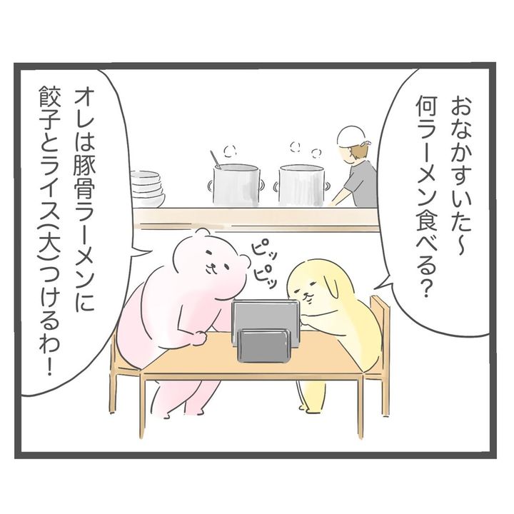 ラーメン屋を訪れた花子さん夫妻。ラーメンチャーハンセットに餃子ライス大をつけて注文してしまったようで、花子さんもチャーハンを食べることに。そして、「ちょっとお腹いっぱい」と感じ始めた時、夫はさらに替え玉を注文したのでした。