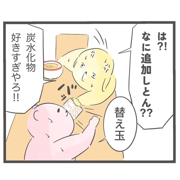 ラーメン、チャーハン、ライスと、炭水化物を豪快にたいらげる夫の姿が印象的です。そのうえ替え玉も注文してしまうなんて、かなりの大食いですね!