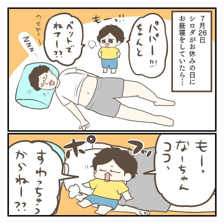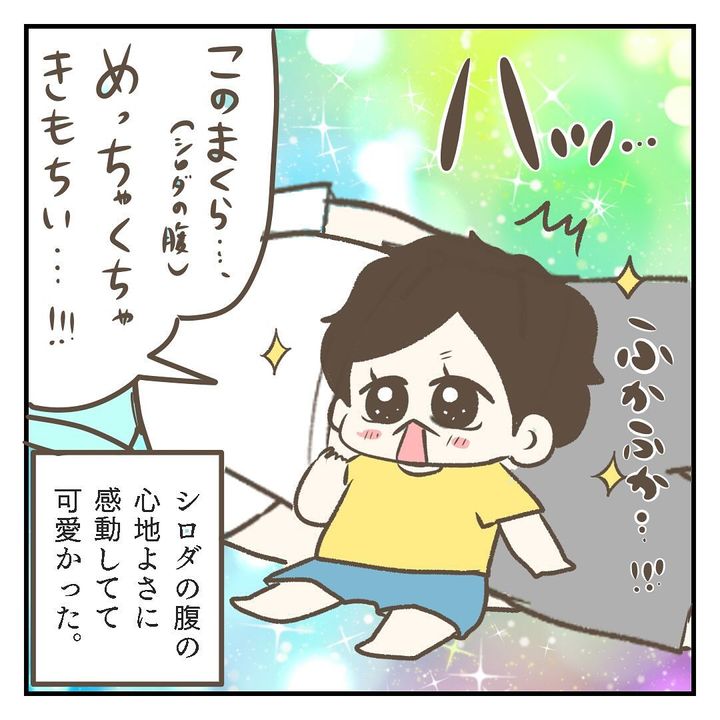 昼寝をする夫のシロダさんのお腹に頭を乗せ、「このまくら…、めっちゃくちゃきもちい…!!!」と目を輝かせるなーさんがとても可愛らしいです。なーさんの可愛らしさを存分に堪能できる、素敵な夏休みになりそうですね!