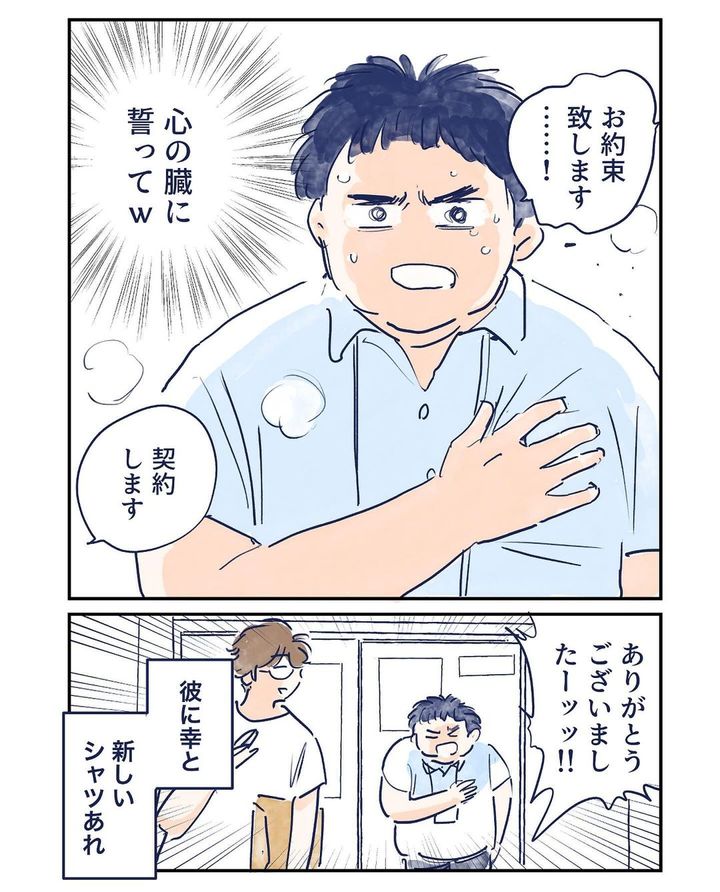 契約書類に記入をしてもらうべく、胸ポケットに刺さったボールペンを取り出そうとする男性。すると、ボールペンの芯が生地を貫通し、胸部に刺さってしまうという悲劇が!痛がる男性は胸に手を当てながら“責任を持ってやらせていただきます”と宣言!その一生懸命な姿に、さらっと「契約します」と返すグッドスリープさんでした…!