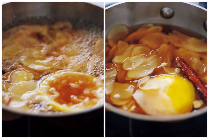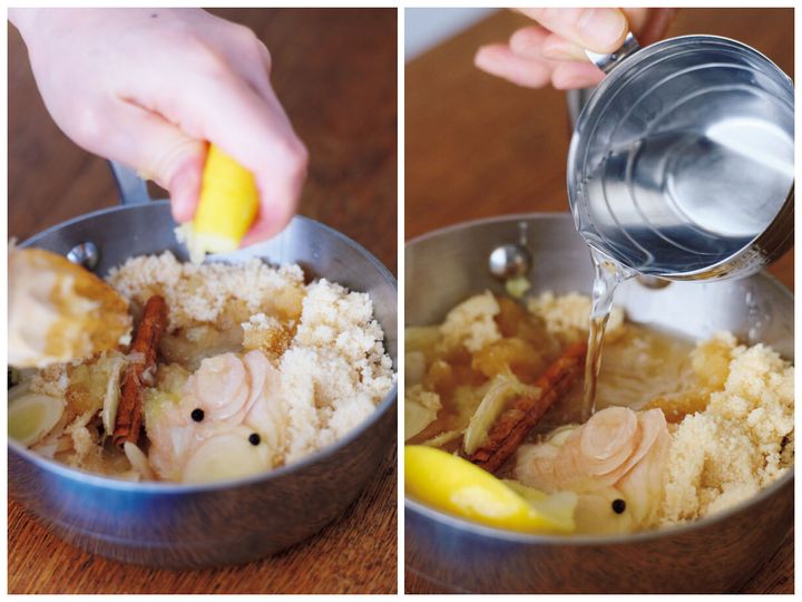 (2)鍋に三温糖、しょうが、シナモン、黒粒こしょうを入れる。レモンの果汁を絞り入れ、残った果肉も皮ごと加えて、水1カップを入れる。