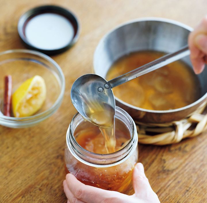 (4)レモンとシナモンを取り出し、さましてから清潔なびんなどに入れて保存する。冷蔵で3週間ほど保存可能。飲むときは、シロップの3~5倍を目安に炭酸水で割る。