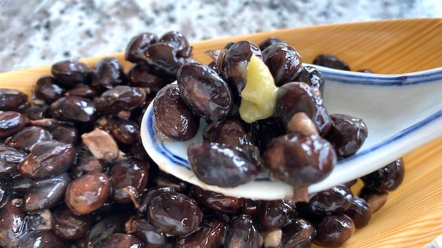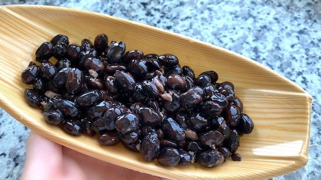 豆がツヤツヤ! 見ただけでふっくらしていることが伝わってきます。道の駅しもつまで作っている「福よ来い納豆」シリーズの1つで、大豆の代わりに大きな黒豆を使用。おすすめしてくれたスタッフさん曰く、「塩味がついているので、ワサビをのせていただくのがおすすめです。醤油はかけないでください」とのこと。