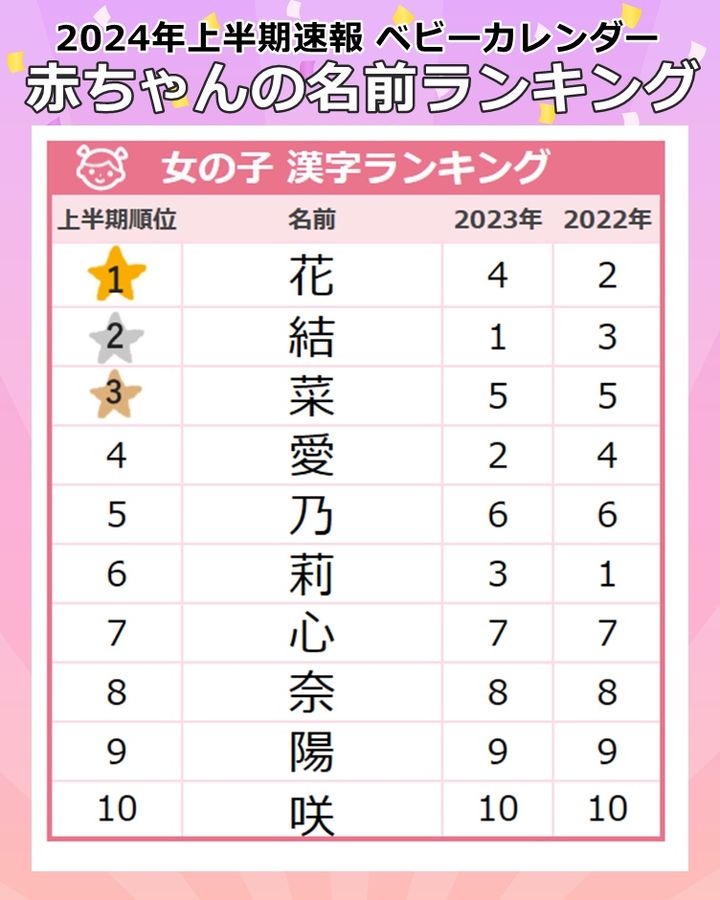 2024年上半期、女の子の漢字ランキングTOP3は、1位「花」、2位「結」、3位「菜」という結果でした。この上半期、女の子の名前は花を連想する「フラワーネーム」が人気に。漢字ランキングでは「花」が首位になったほか、3位「菜」、6位「莉」、10位「咲」といったフラワーネーム関連の漢字がTOP10にランクインしました。