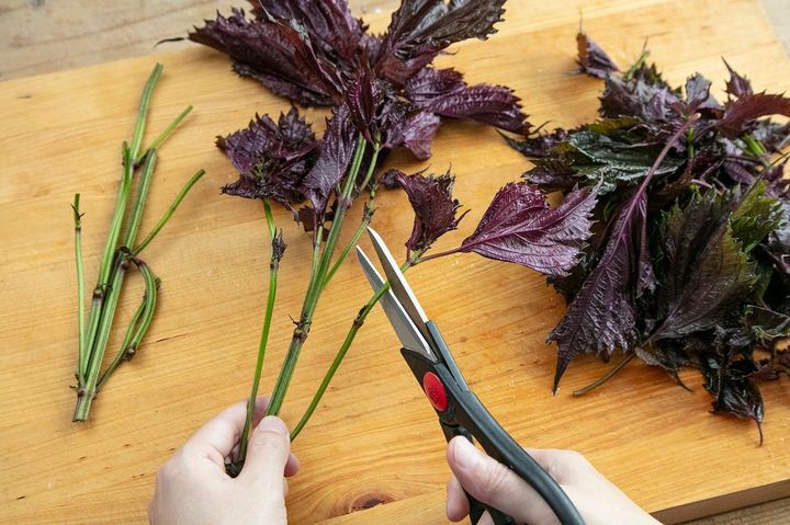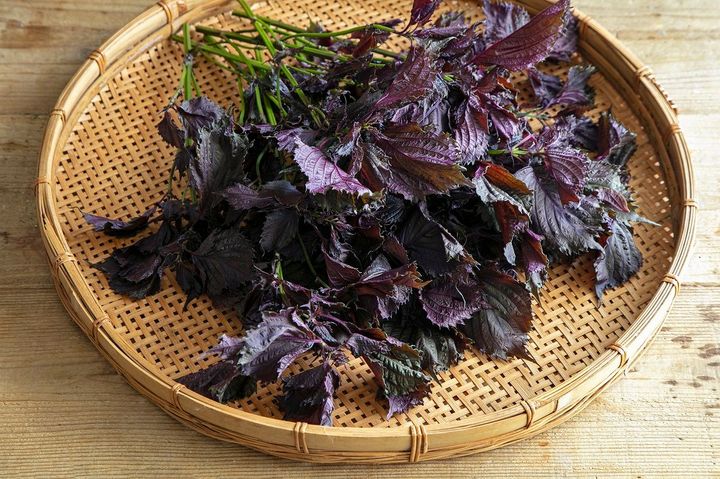 赤紫蘇(赤じそ)は、青紫蘇とは違って6~7月しか出回らない、初夏が旬の食材。青じそに比べてえぐみが強いため、生のままではなく主に加工して食べられます。