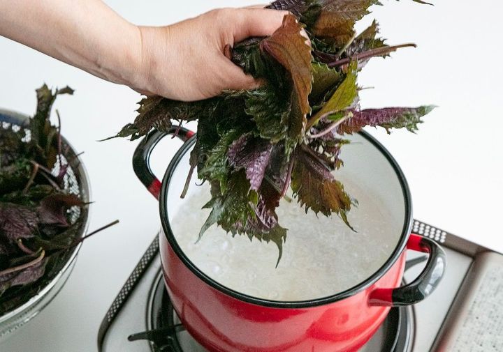赤じそは茎から葉をつみ取って洗い、ざるに上げて水けをきる(葉についている細い茎は取らなくてもOK)。