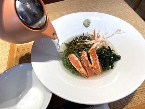 香ばしく炙ったたらこに、九州産高菜、薬味をたっぷりのせた出汁茶漬けです。自分で出汁をかけて食べるのでイベント感も楽しいです。