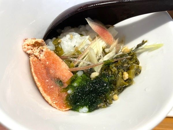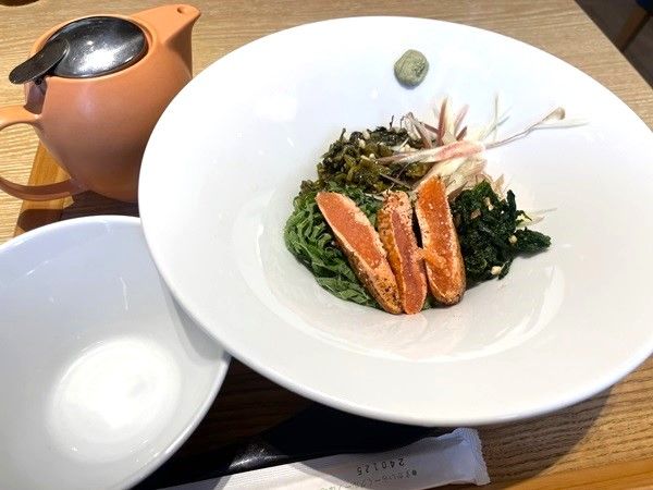 塩気が効いたたらこと醤油味に香ばしく炒めた高菜がご飯と合う! みょうがやねぎなどの薬味もたっぷりで、あっさりと食べられます。旨味たっぷりの出汁もたまらなく美味しい! 飲んだ次の日や食欲がない日でも、するするっと喉を通っていきます。これからの暑い日もこれならさっぱりと食べられそうですよ。
