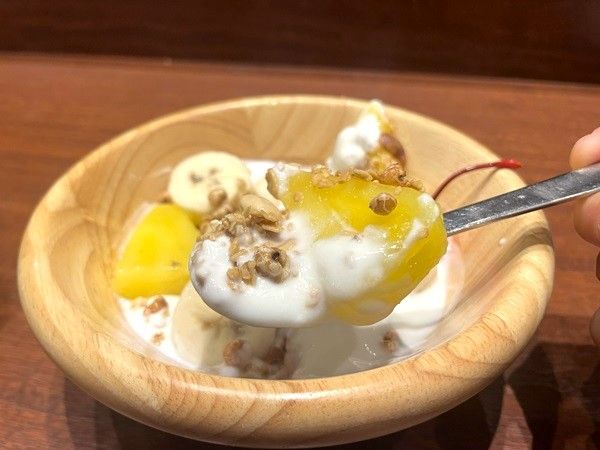 とにかくフルーツがたっぷり! アメリカンチェリーもトッピングされています。風味豊かなオーツ麦のグラノーラは粒が大きく、ザクザクとした歯応えがいいです。フルーツもシリアルもグラノーラもたっぷり、さらにはヨーグルトの分量が多いので、腸活したい人にもおすすめ。
