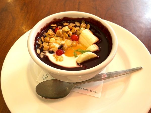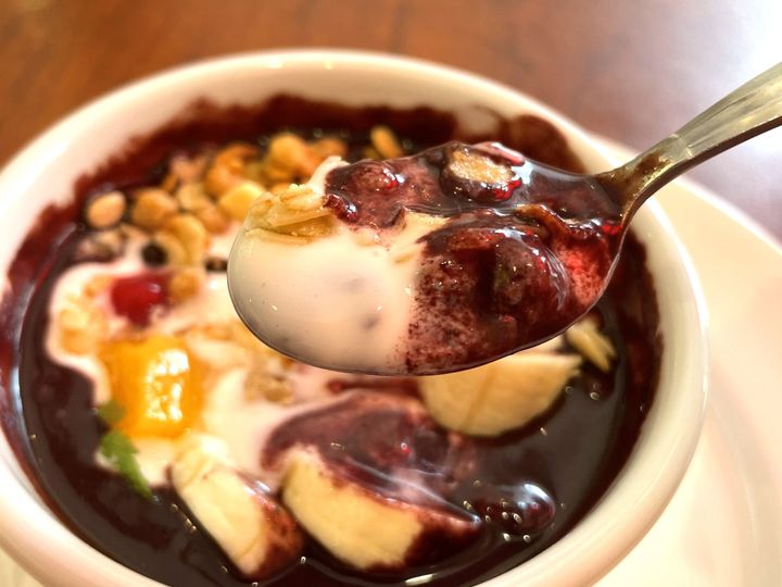 ブラジル・アマゾン原産のアサイーを使い、ヨーグルト、グラノーラ、黄桃、バナナを乗せたヘルシーな一品。一口食べてみると、アサイーの濃厚な味とヨーグルトの酸味がよく合います。黄桃とバナナの甘さがアサイーともよく絡み合って美味しい! グラノーラの食感も楽しく、最後まで飽きることなくスプーンが進みました。