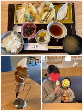デザートは亀ヶ池温泉の可愛い亀のビスケットがのってるソフトクリームを息子と半分こして、ごちそうさまでしたっ!!!