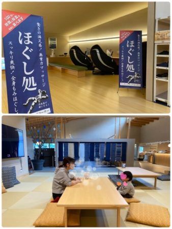 出てすぐに憩いの場があり、マッサージ機が並ぶコーナーや、小上がりの座敷になっている所では、テレビを見たり、寝転がったり、息子は下で走り回っていましたが、そのくらい広い寛ぎスペースがあるのが嬉しいですね。