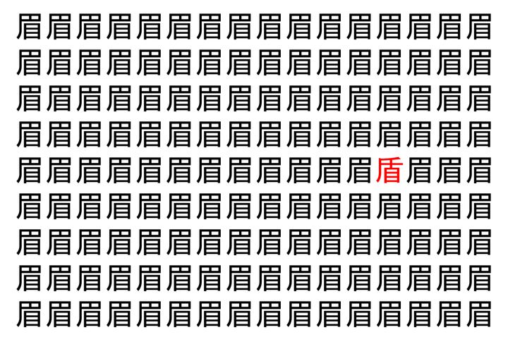 画像の中には、「眉」という漢字が縦に9行、横に16個並んでいます。 全部で144個となりますが・・・、そのうち1つは「異なる漢字」となってますよ!!