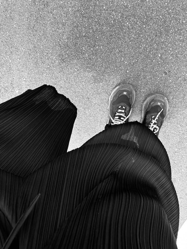 オールインワンなのにワンピースを着ているかのように見える足元。なんと、オールインワンの片脚分に両脚を入れて歩いていたのです。