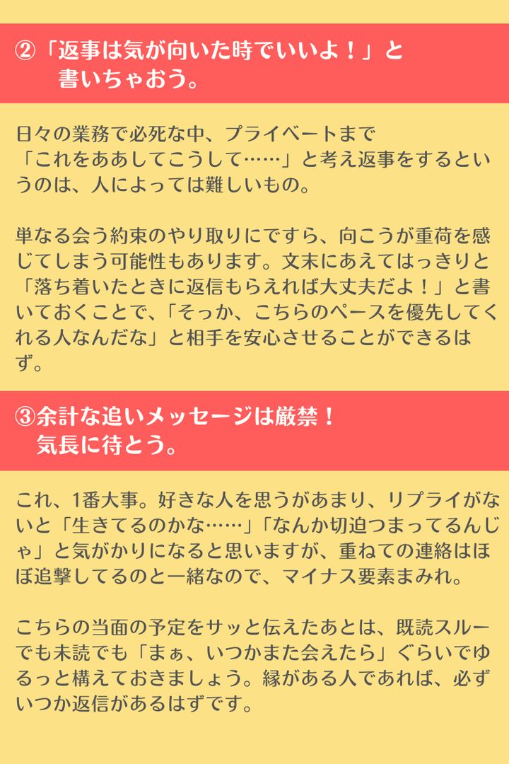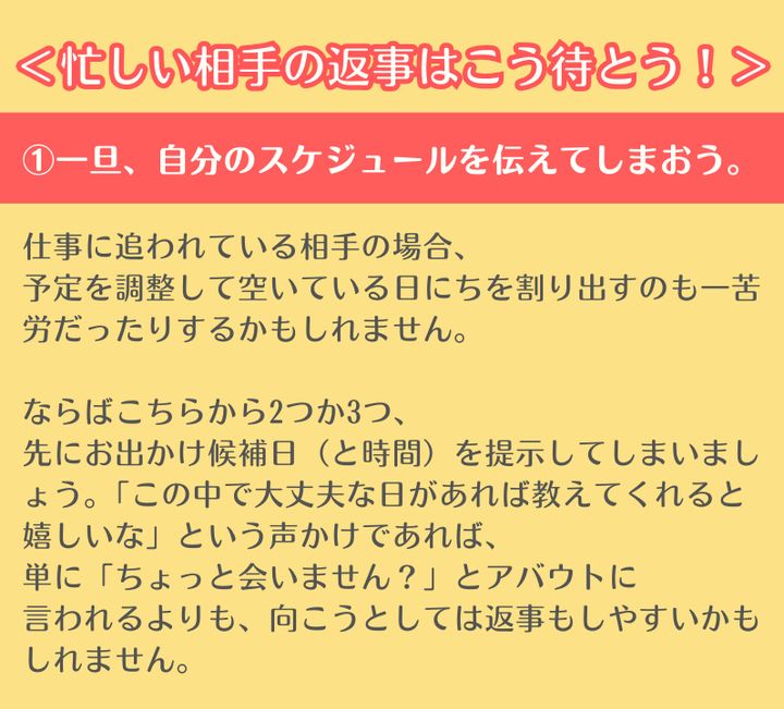 なんなら日を改める場合もそれっていつごろならいけそうなのかとか、可能な限り相手と積極的にメッセージのやり取りしてパパッと決めちゃいたい方でもあるの。