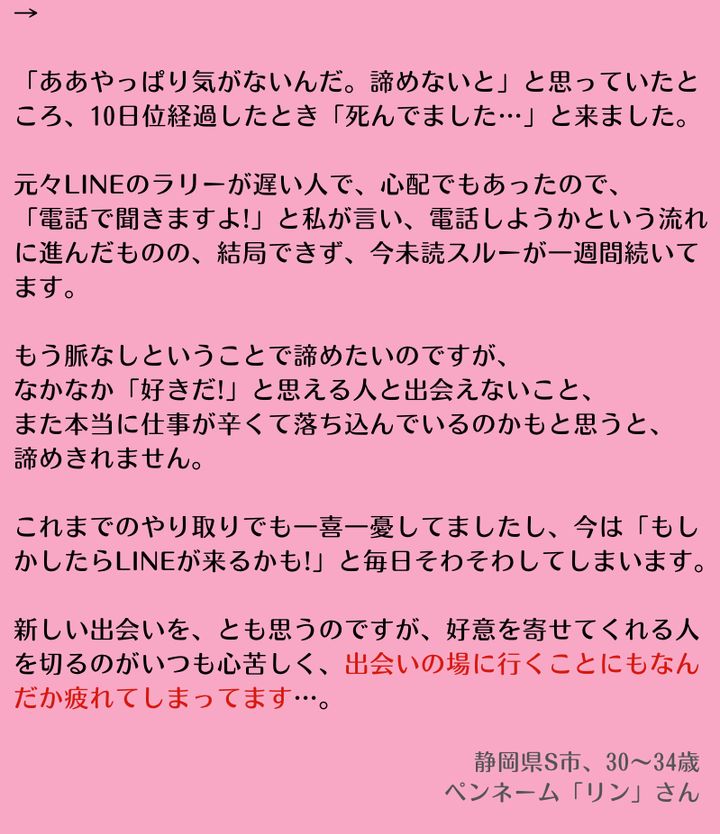 リンさんの相手がどんな方かはわからないけれど、もし相手からその後とんとレスがないという場合は、その恋きちんと諦めるしかないかもしれない。
