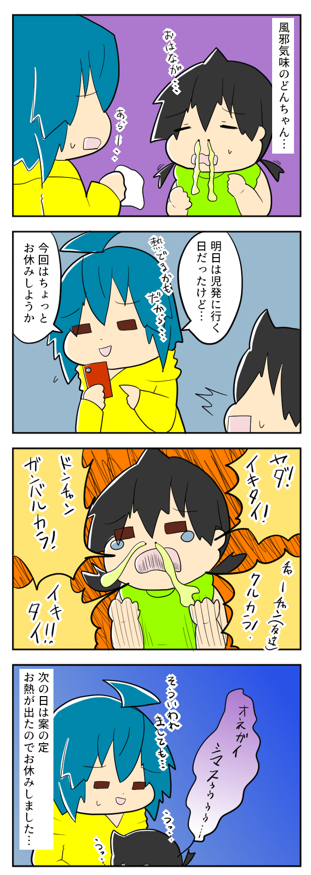 2016年生まれの兄ぽこちゃん、2018年生まれの妹どんちゃんのママであるmochikoさんから、風邪をひいたどんちゃんのお話です。風邪気味のどんちゃんを見てmochikoさんは翌日の予定をキャンセルしようとしたのですが・・・。