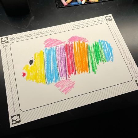 クラゲ・カメ・マグロ・タツノオトシゴなどいくつかの海の生き物の絵に自分の好きなように色を塗ったり、文字を書いたり…そうして生まれた世界に一つだけの生き物たちが実際に泳ぎ出し、一つの作品となっていきます。 そして、その空間は延々と変化していくのです。 私も早速参加してみました!描いたのは「クマノミ」です。