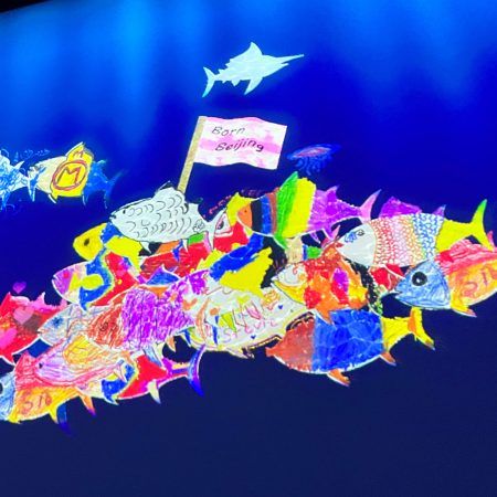 自分が描いた魚が泳ぐ姿を見た子どもたちは大興奮!大人であっても嬉しくてつい声が出てしまいます。