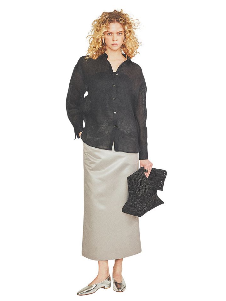 【POINT】体にまとわりつかない絶妙な身ごろのシャツ。ボディラインが出るトップスが苦手でも、細身スカートと合わせてIラインシルエットの形成が可能。手持ちのかごバッグも黒でそろえ、統一感を高めて。