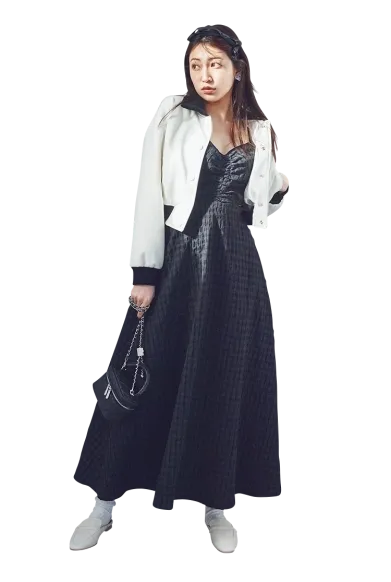 ポコポコした生地が特徴のキャミワンピースに、ショート丈のジャケットをプラス!メリハリのあるコーデに仕上がるうえ、ショート丈のジャケットで足長効果を演出できます。