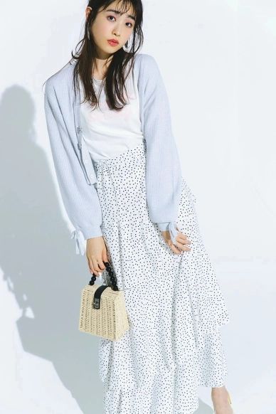 ホワイトワントーンでまとめて清楚感をプラス!淡いカラーのカーディガンをあわせれば、涼しさと上品さを演出できます♡
