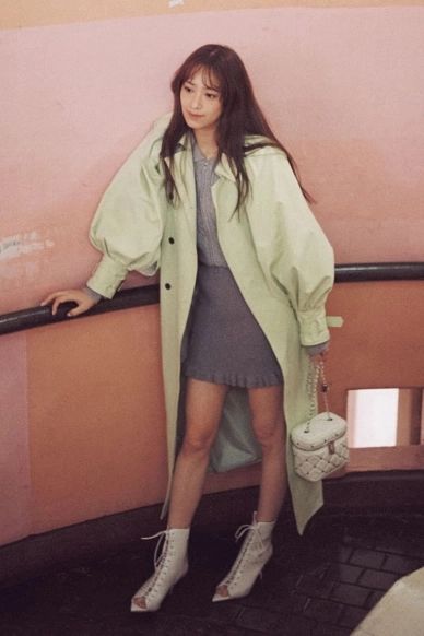ライムのトレンチコートは重すぎなくて、季節の変わり目の羽織にピッタリ!ミニ丈のボトム&レースアップブーツで適度に肌見せして抜け感を演出しましょう。
