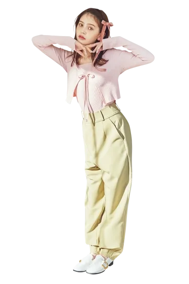胸元のリボンが可愛いピンクカーディガンを使ったパステルコーデ。明るいベージュのパンツをあわせて甘すぎず、軽やかに仕上げるのがポイントです。