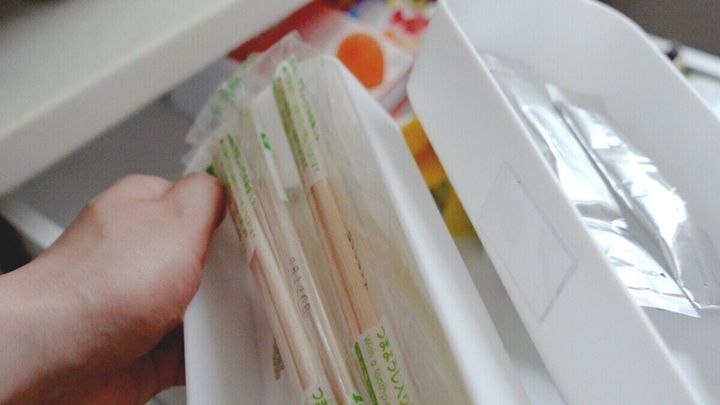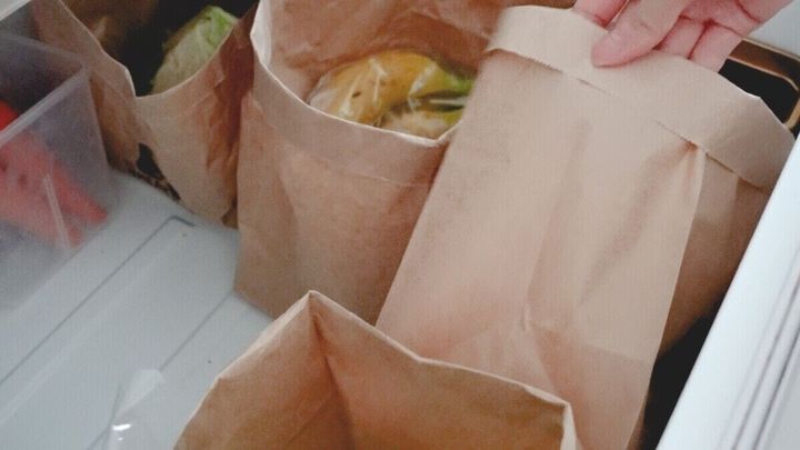 野菜室で使っているセリアの食品用ガゼットバッグ。バッグとバッグがずれないようにクリップでとめているのですが、このテープを貼って固定してみました。
