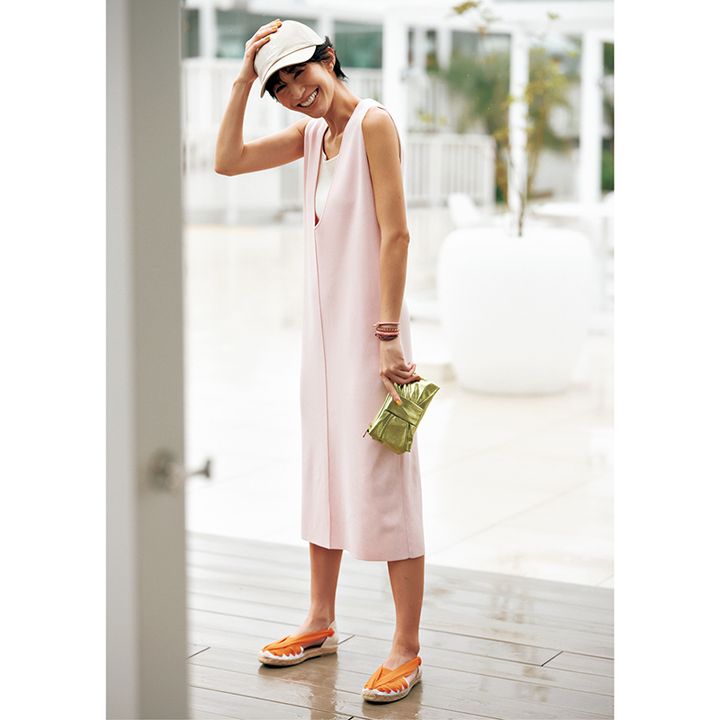 夏に着たくなる白や薄ピンクの淡色アイテムたち。のっぺりしがちな色合いだから、差し色に選んだのは鮮やかなゴールドやオレンジのハッピーカラーの小物たち。バッグとサンダルを別の色にすれば、差し色にも奥行きが出ます。