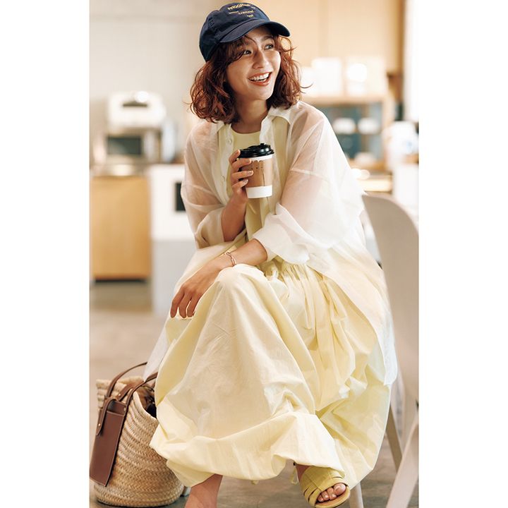 羽織りもの=カーデという常識に透けシャツの選択肢が急上昇。カーデよりも見た目が夏らしく、風通しも確保でき、たためばコンパクトになりバッグインも可能です。レモン色ワンピ×黄色サンダルのワントーンコーデに透け感のある白シャツで涼しげにまとめて。