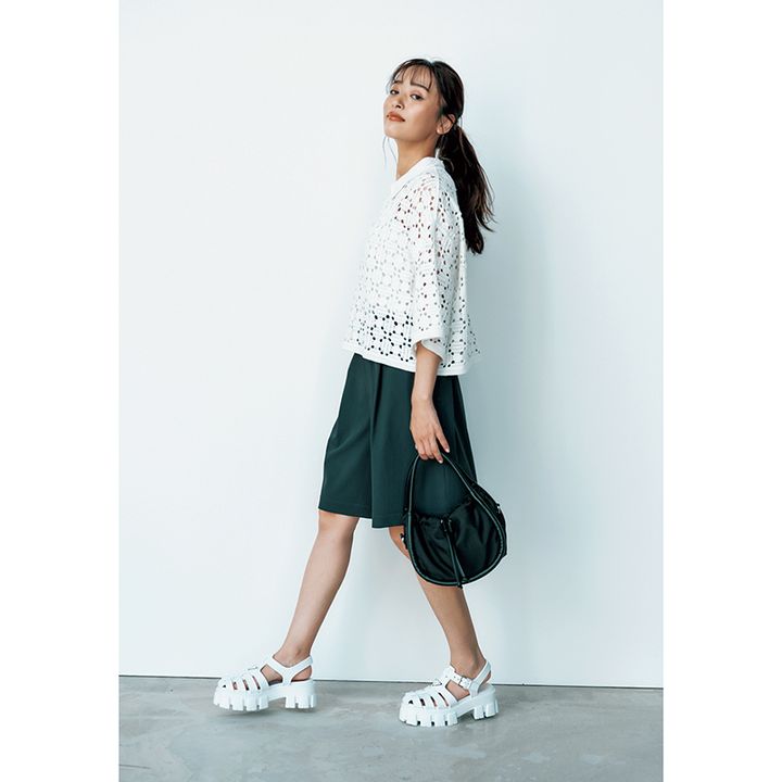 厚底のラバーサンダルとショートパンツなら、雨の日や突然の集中豪雨にも対応可能。水はねも気になりません。ボトムスがカジュアルなぶん、白トップスで甘めに盛って。