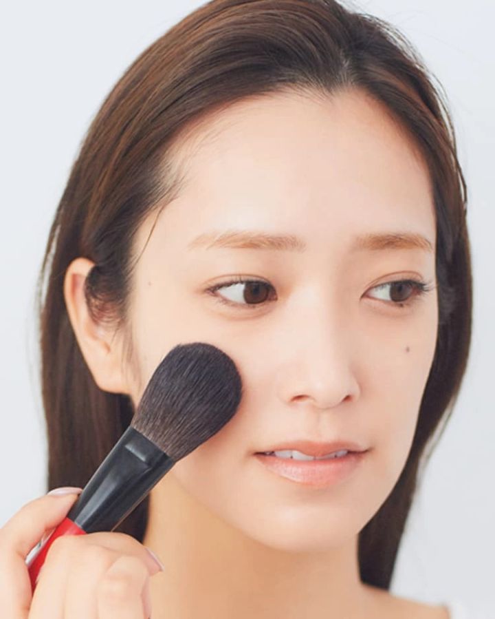 eは薄づきに仕上げやすいブラシで塗る。コンシーラーをのせた部分だけ、小さめブラシでトンとおさえるように塗布。そのあと、大きめブラシで顔全体にふんわりのせる。