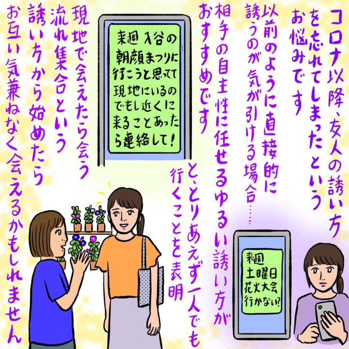 「コロナが落ち着いてしばらくたちますが、友達への誘い方を忘れてしまって、1人で平気になったこともあり、どうやって友達とプライベートで会えばいいかわかりません。自分から、お茶、ご飯、海外旅行、イベントなど、コロナ前は誘ったり誘われたりしてアクティブに過ごしていましたが、今はお茶はともかく旅行なんて誘ったら負担じゃないかと考えすぎて、つい気楽な妹と出かけることか多いです」(洋子さん29歳)