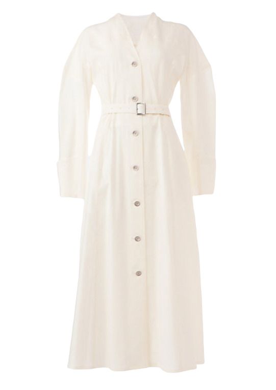ワンピース /AKIRANAKA(ハルミ ショールーム) 白のシンプルな長い丈でそでの折り返しもアクセント。ノーカラーのシャツワンピでレイヤードもしやすく、付属のベルトを締めればより美しいフレアシルエットに。