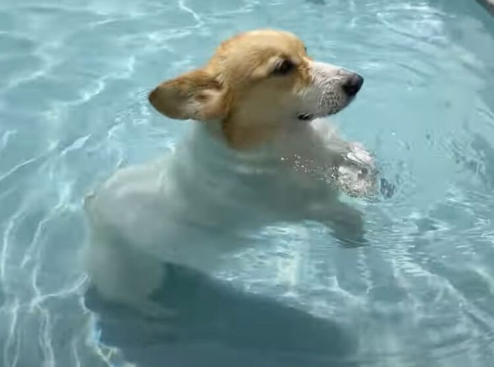 3. 見て! 新しい泳ぎ方を発見したよ♪ プールを楽しむコーギー犬。
