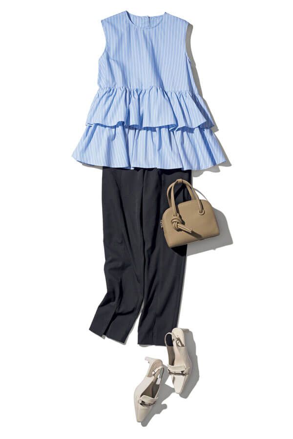 ピンストライプ×ブラックのきれいめ通勤ルックに、ボリューミーなティアードヘムで女性らしさをトッピング。