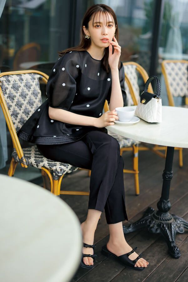 素肌がほんのり透けるシアー素材なら、全身黒でも重たくなりすぎず、いいアンバイに。プチリボンを配したリボンミュールもクラシカルで可愛い。
