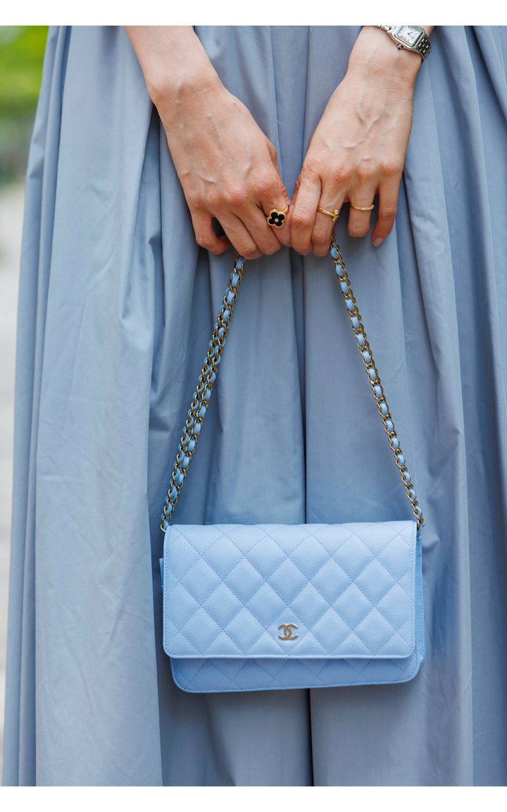 「チェーンウォレットを探している時に、鮮やな水色のカラーに一目惚れ。娘と過ごす時は、両手が空くことが絶対条件なので、斜め掛けにできるこのバッグは重宝しています。ワントーンでなじませても可愛いし、オールブラックやオールホワイトに差し色にすることもあります」富永真菜さん・166cm (29歳/3歳の女の子ママ)