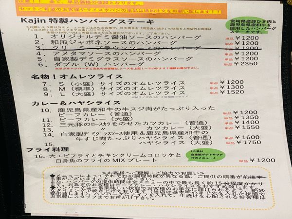 メニューは、ハンバーグステーキ、オムレツライス、カレー&ハヤシライス、フライ料理など。 ハンバーグステーキは佐賀県産和牛と宮崎ポークの合挽きなんですって。 4種類のオリジナルソースから選べるので迷っちゃいますね。 でも私は最初から名物のオムレツライスと決めていたのですぐにオーダー! オムレツライスはS(小盛)、M(標準)、L(大盛)から選べますよ。