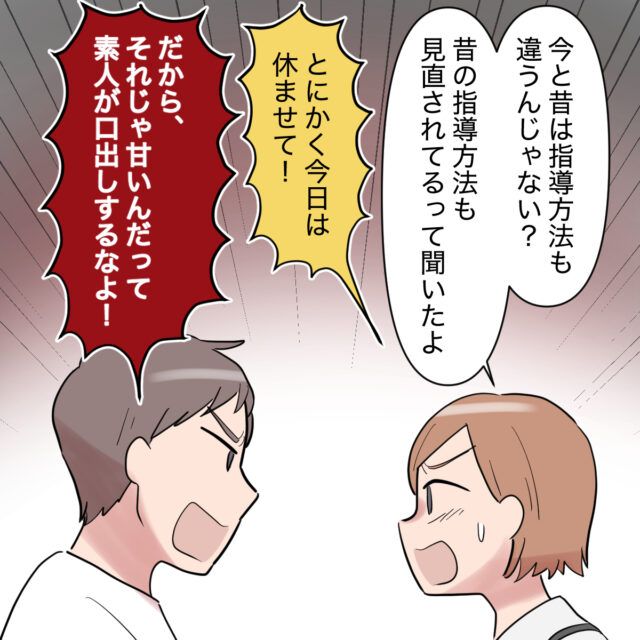 「今と昔は指導方法も違うんじゃない?昔の指導方法も見直されてるって聞いたよ。とにかく今日は休ませて!」